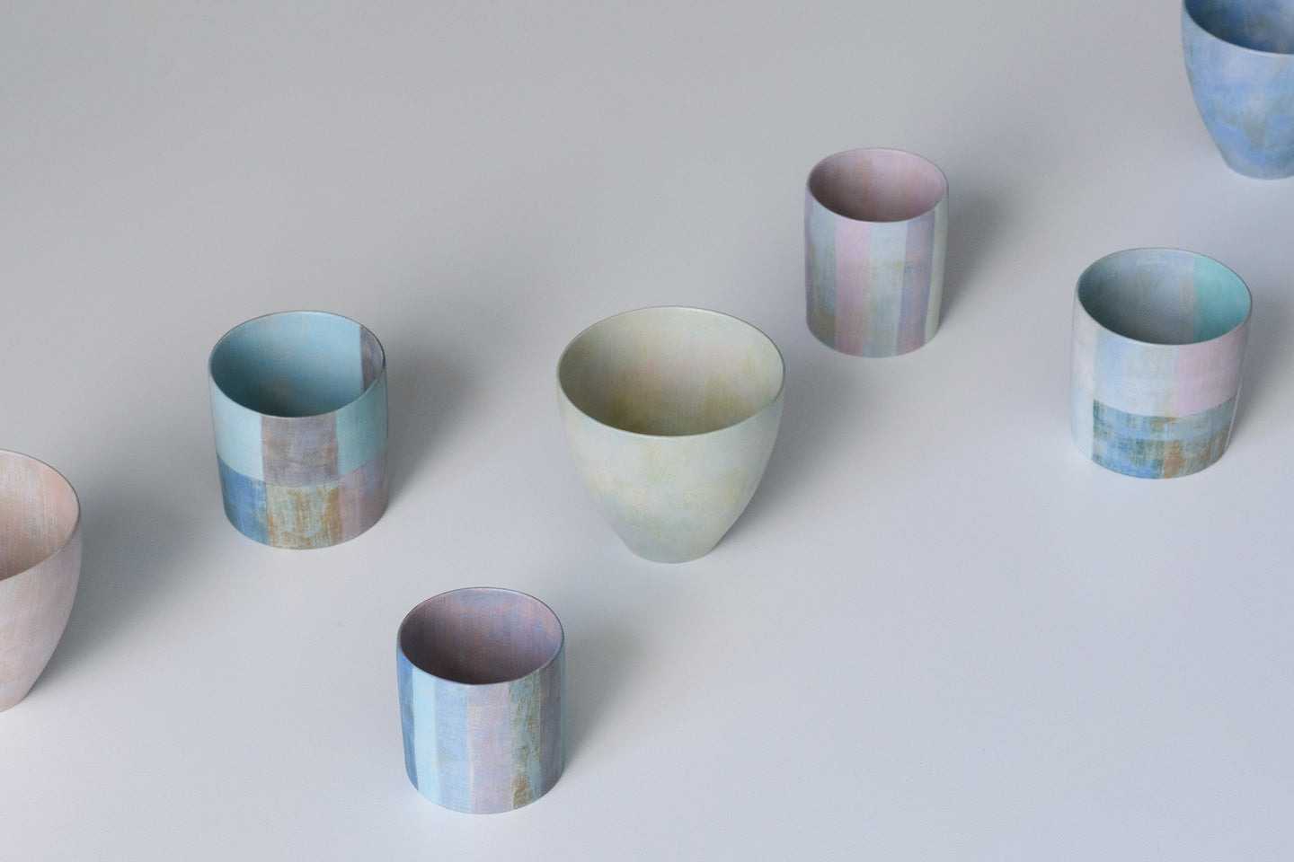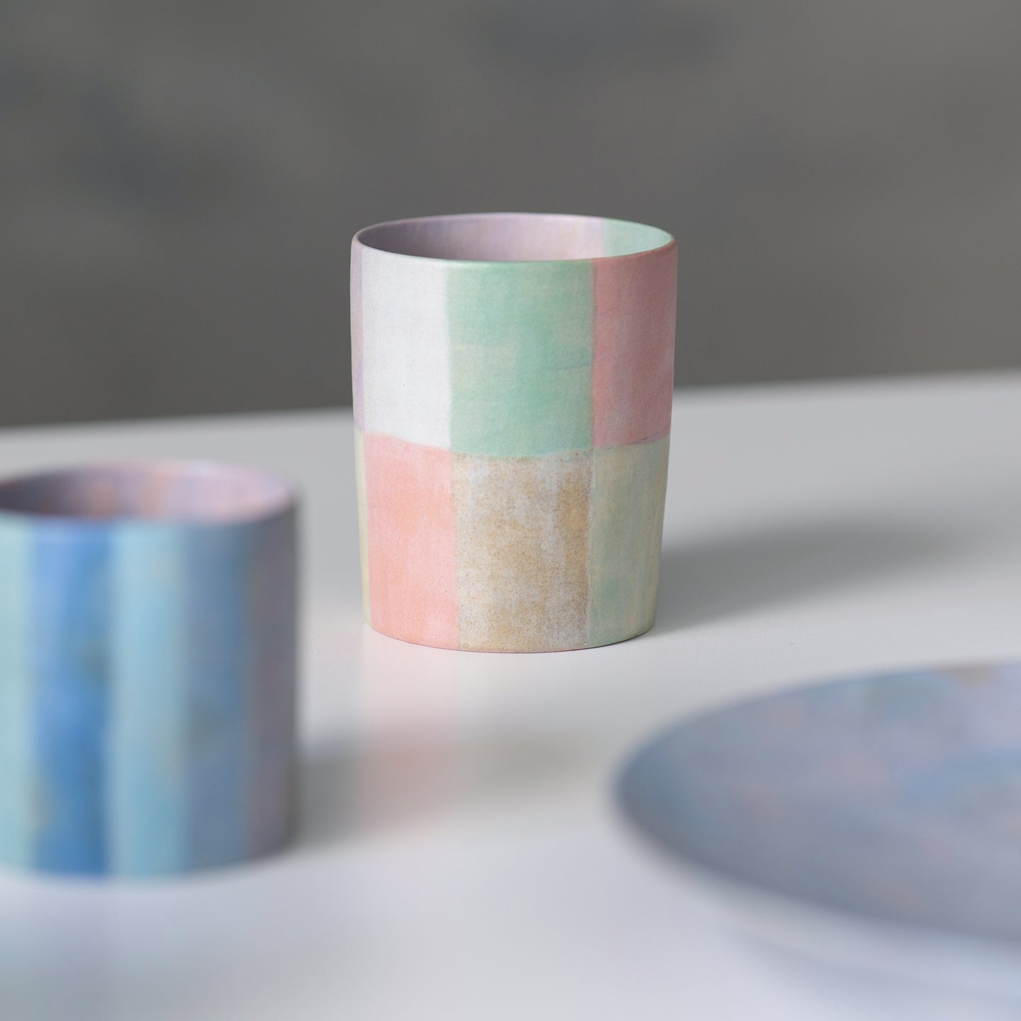 For example, the grid patterns composed of various colors arranged in a lattice - something I’ve been making frequently lately - were created to explore how adjacent colors appear in a minimal format. The vertical and horizontal lines that form the grid align with the rotational shape of the vessel, and I feel this structured pattern represents one of the most minimal forms of decoration.