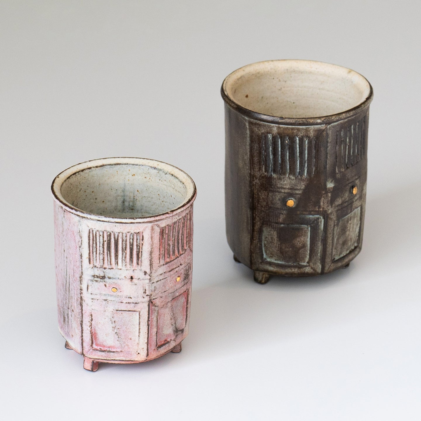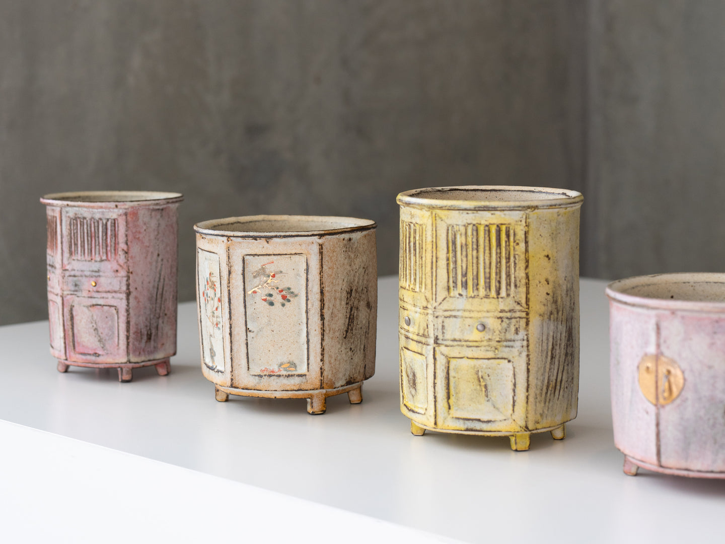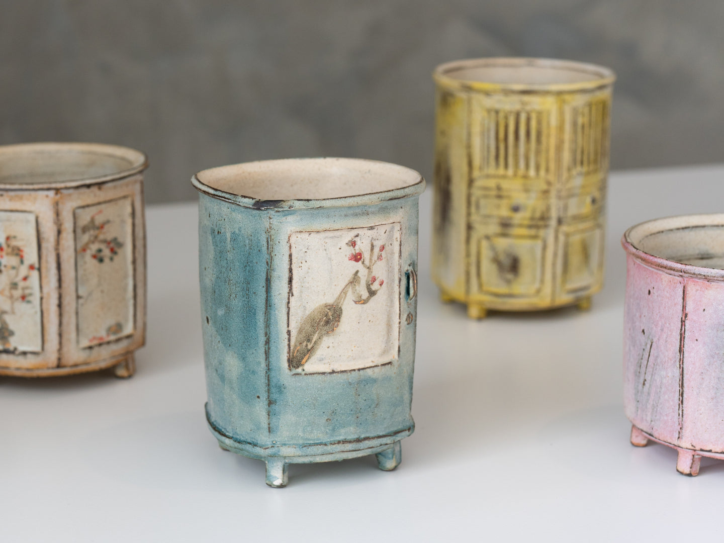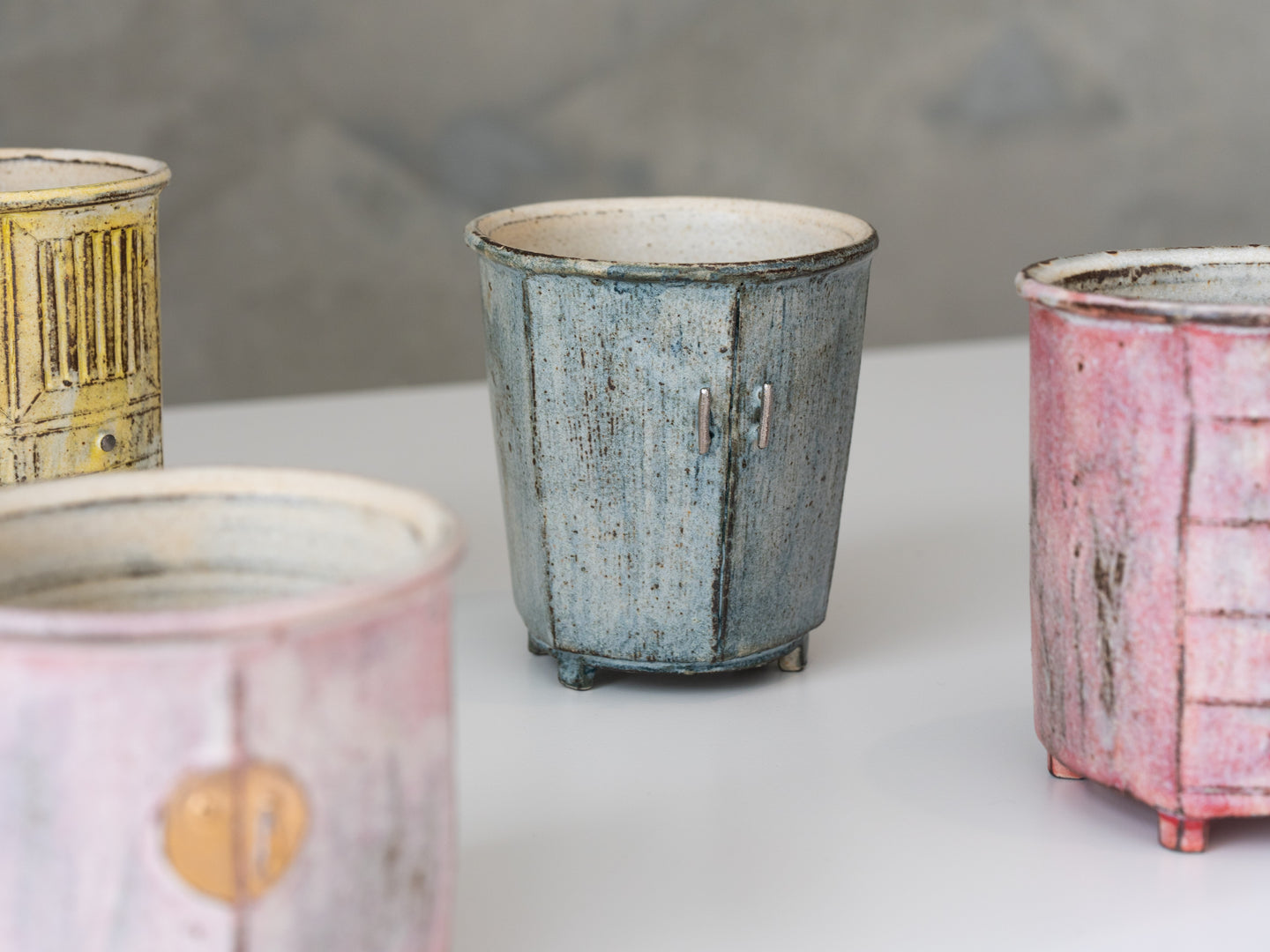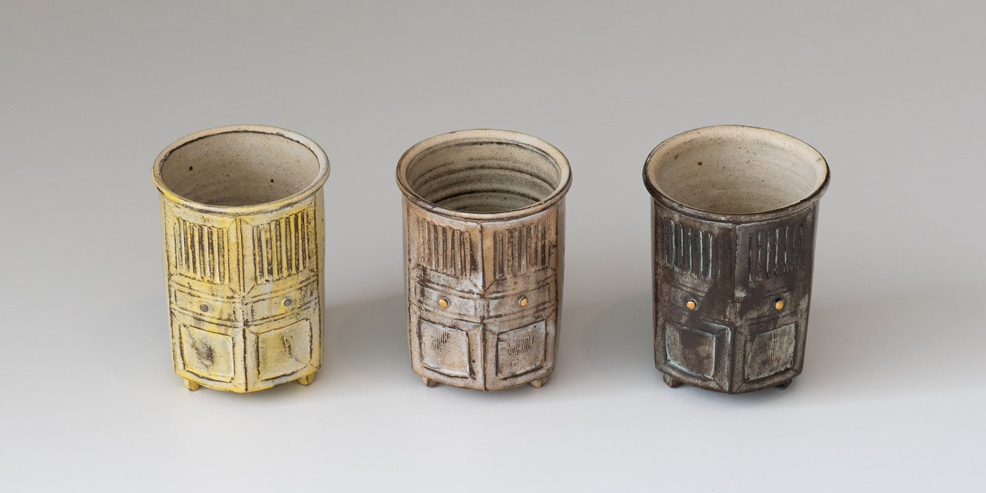 The idea for the cabinet-shaped cup series came to me during the Modern Home Design Expo in Shanghai. While exploring the exhibition, I was fascinated by the variety of cabinets on display - essential, functional objects with such unique designs. It struck me that incorporating the form of cabinets into ceramic cups could create pieces that are both practical and full of narrative charm. Inspired by this, I began experimenting with the idea of transforming cabinet shapes into ceramic designs.