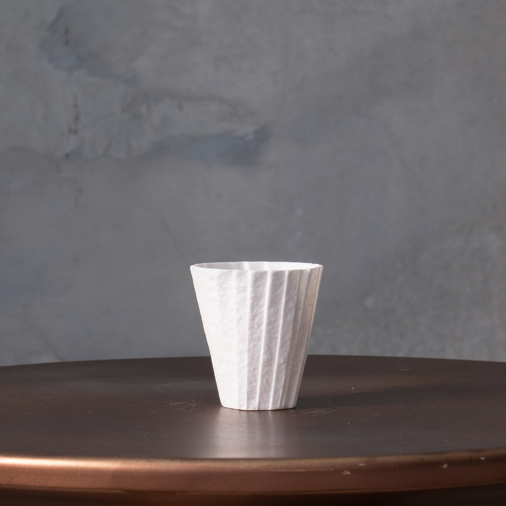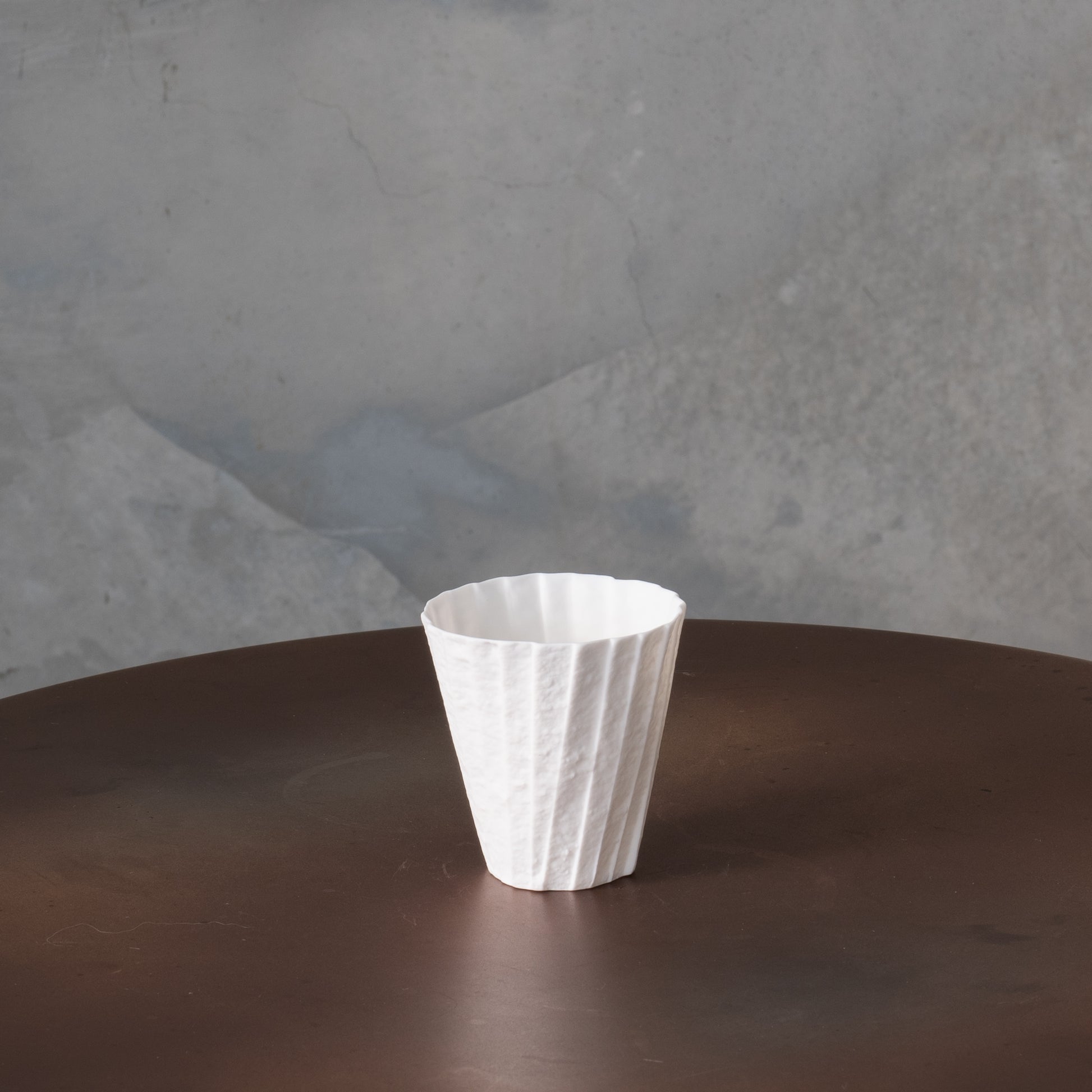 Experience sheer delight at the touch of this cup, where extreme thinness and delicacy rival that of folding paper. Fired at high temperatures, this robust porcelain not only exudes fragility but also allows light to gracefully dance through, illuminating its folds even from within.