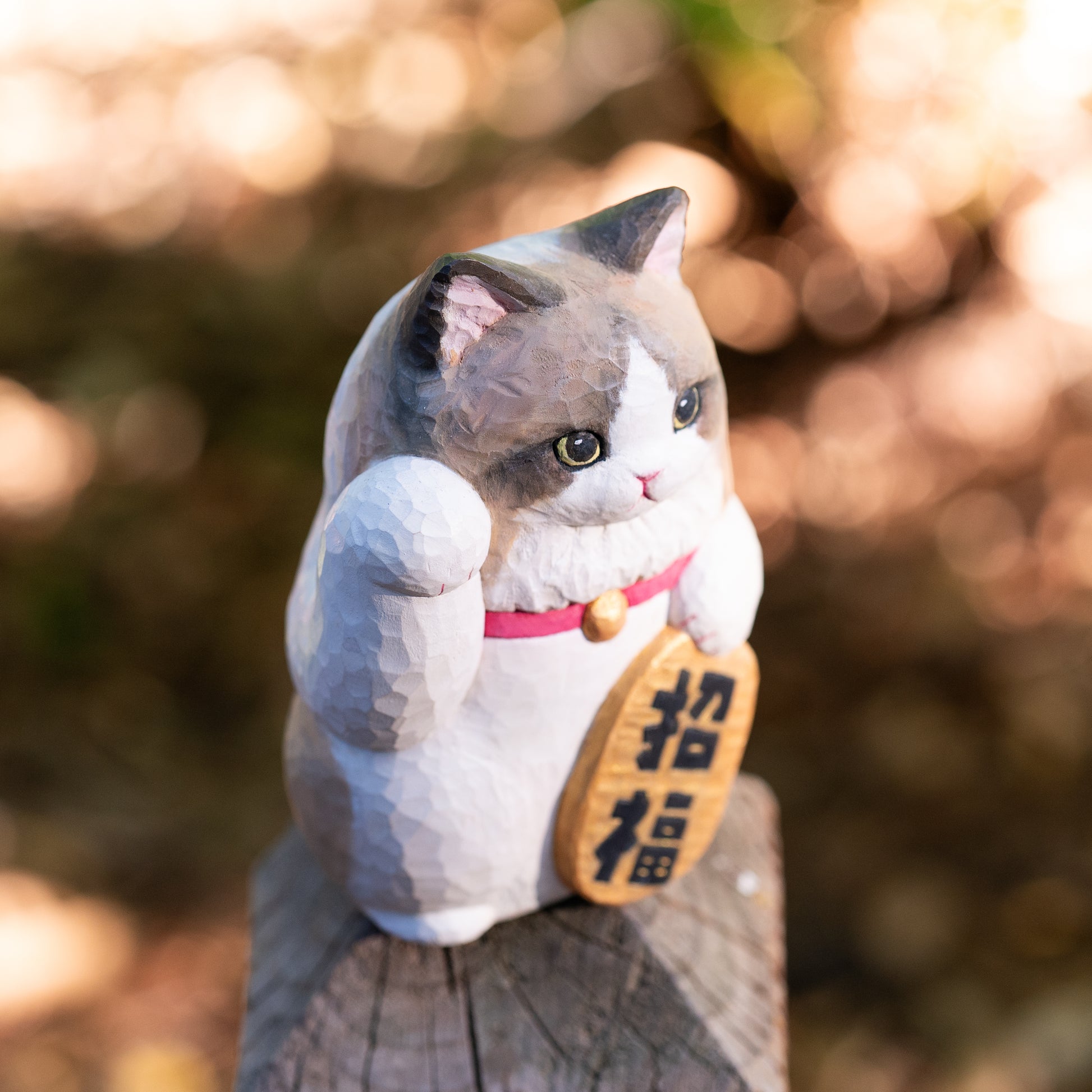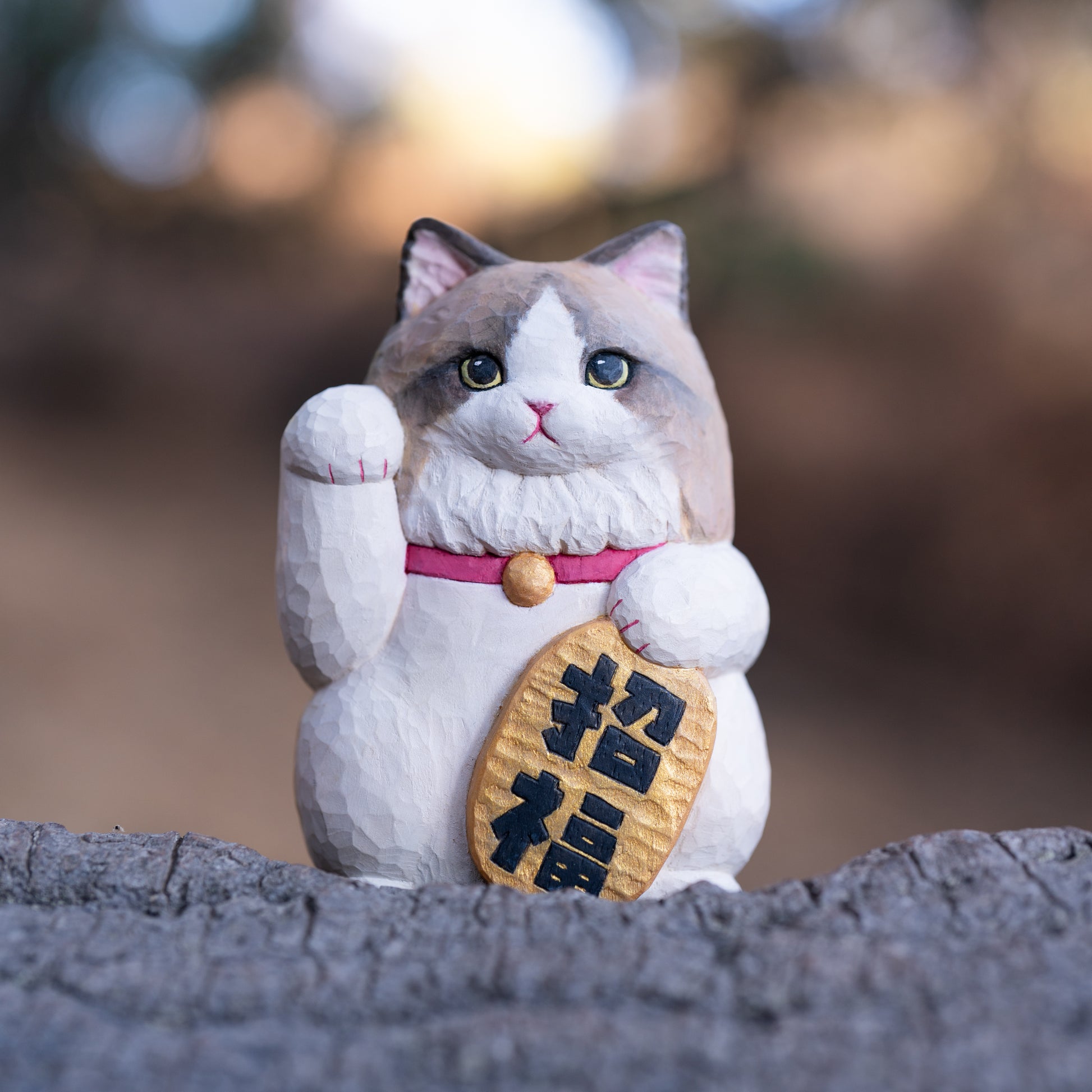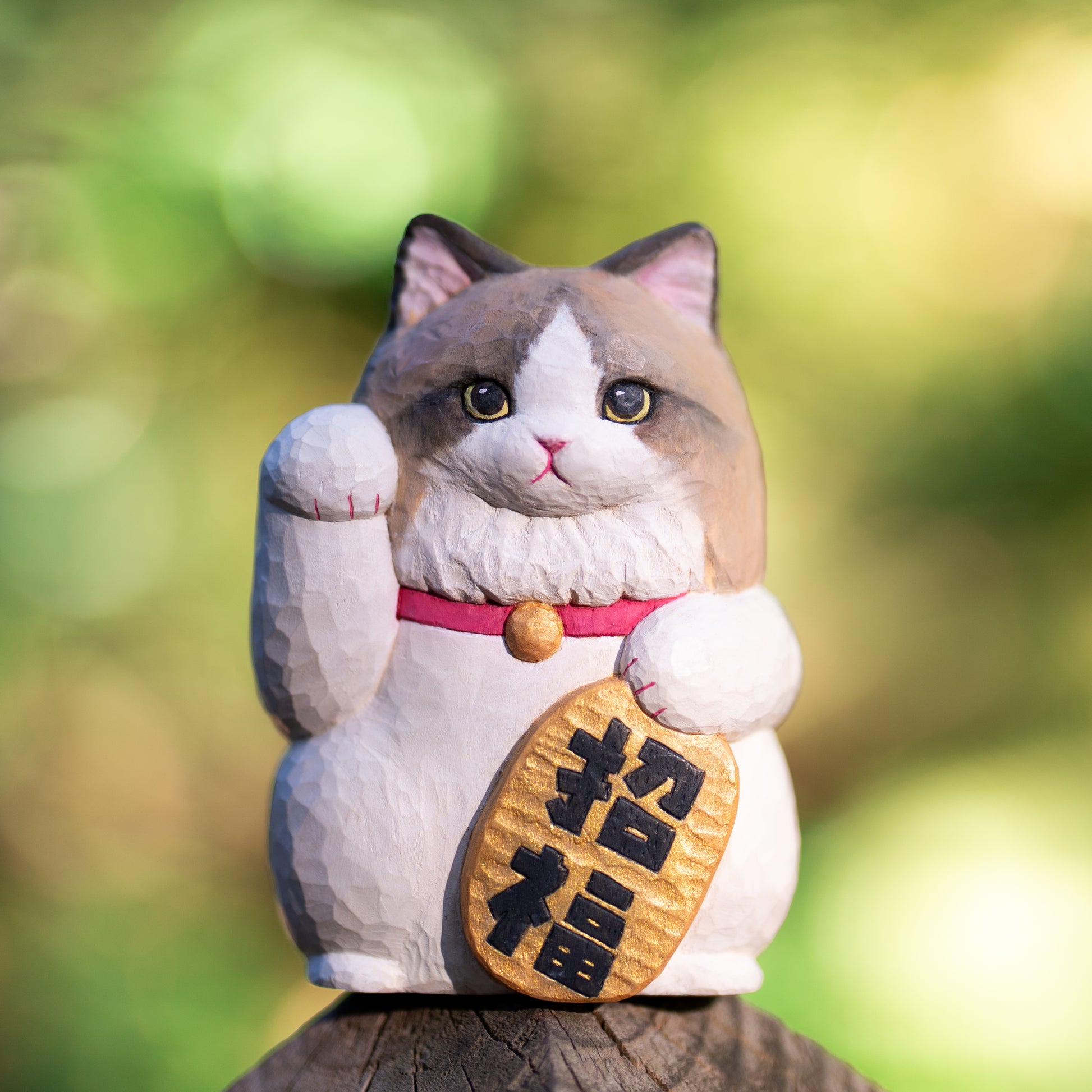 A hand-carved wooden sculpture depicting the beloved Maneki-neko, or ‘beckoning cat.’ In East Asian culture, the 招福猫 (literally ‘fortune-inviting cat’) is believed to bring joy, peace, and positive energy to its surroundings. With its gentle expression and welcoming gesture, this figure carries a heartfelt wish for happiness and well-being.