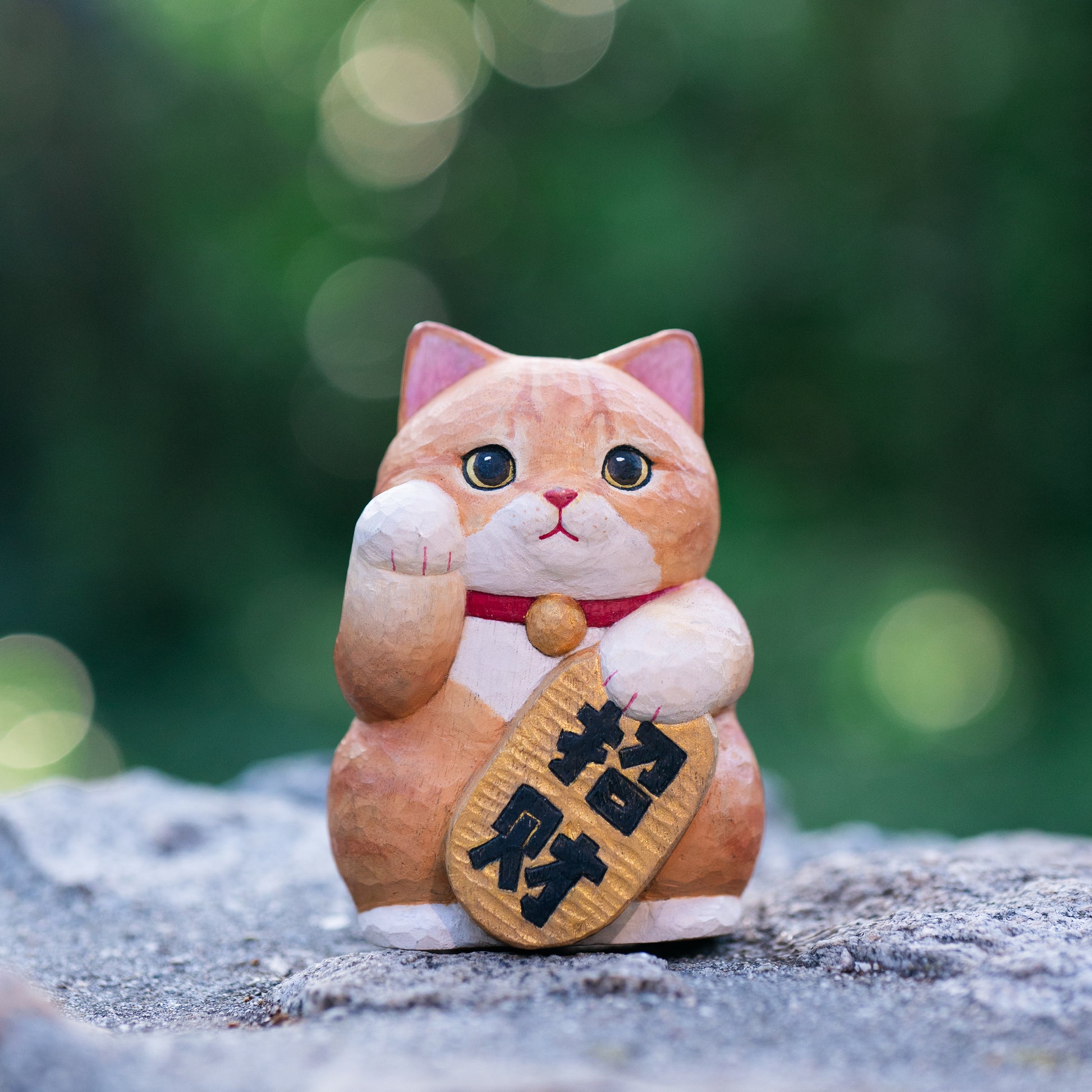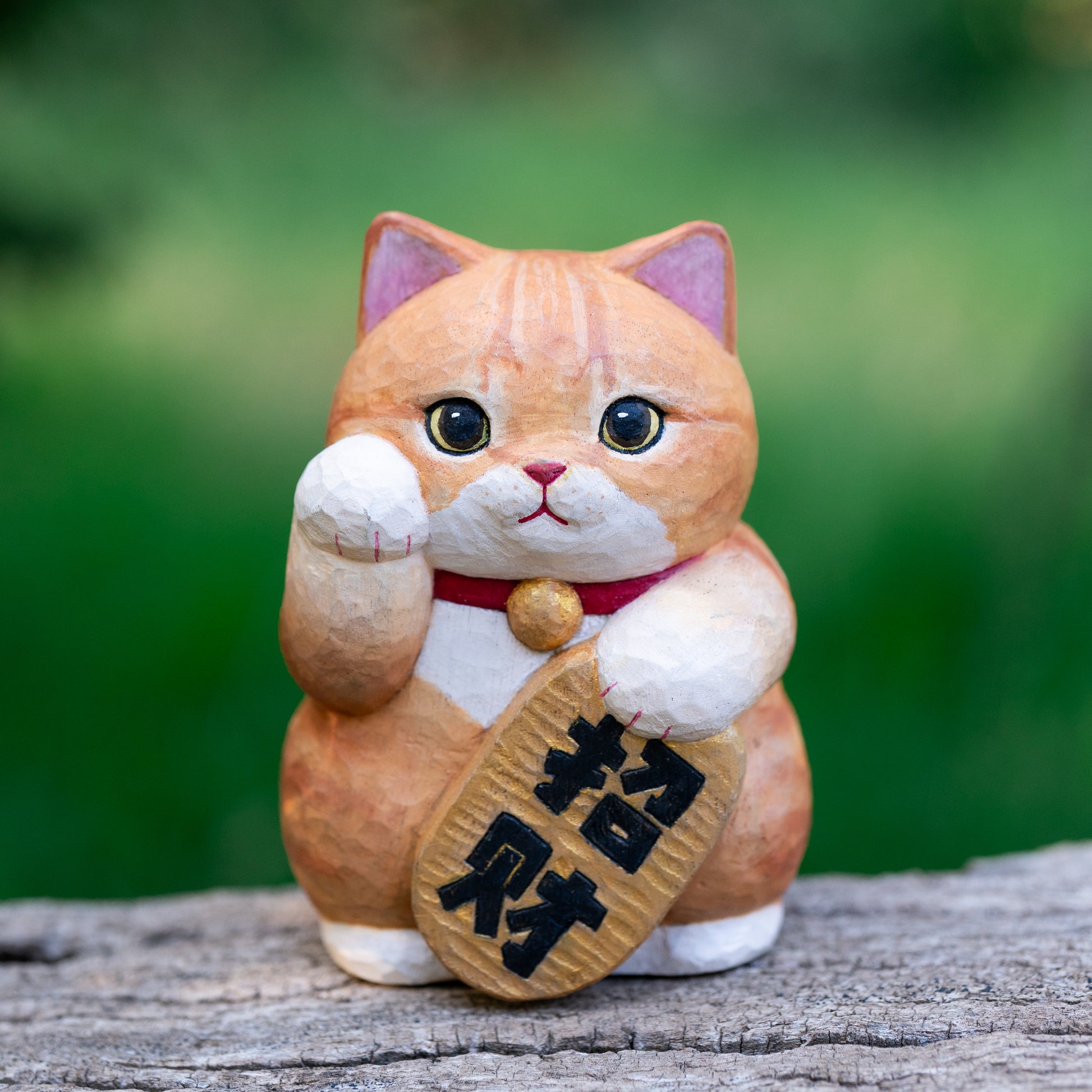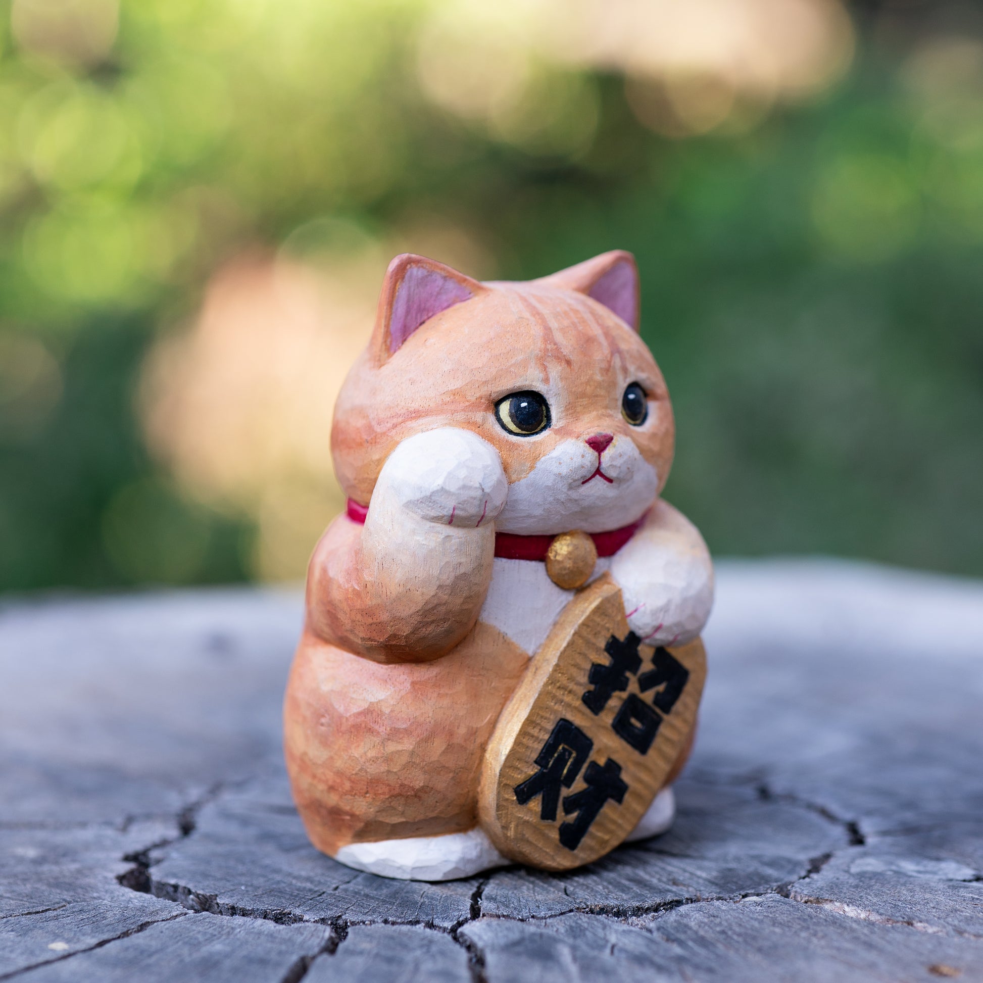 A hand-carved wooden sculpture depicting the beloved Maneki-neko, or ‘beckoning cat.’ In Japanese and Chinese culture, the Maneki-neko is a symbol of good fortune and prosperity, often placed at shop entrances or homes to invite happiness, luck, and success. With its paw raised in a welcoming gesture, this charming figure brings a warm wish for abundance and joy.
