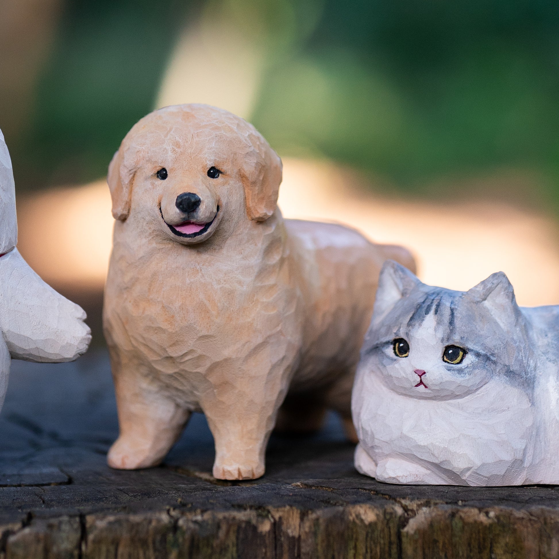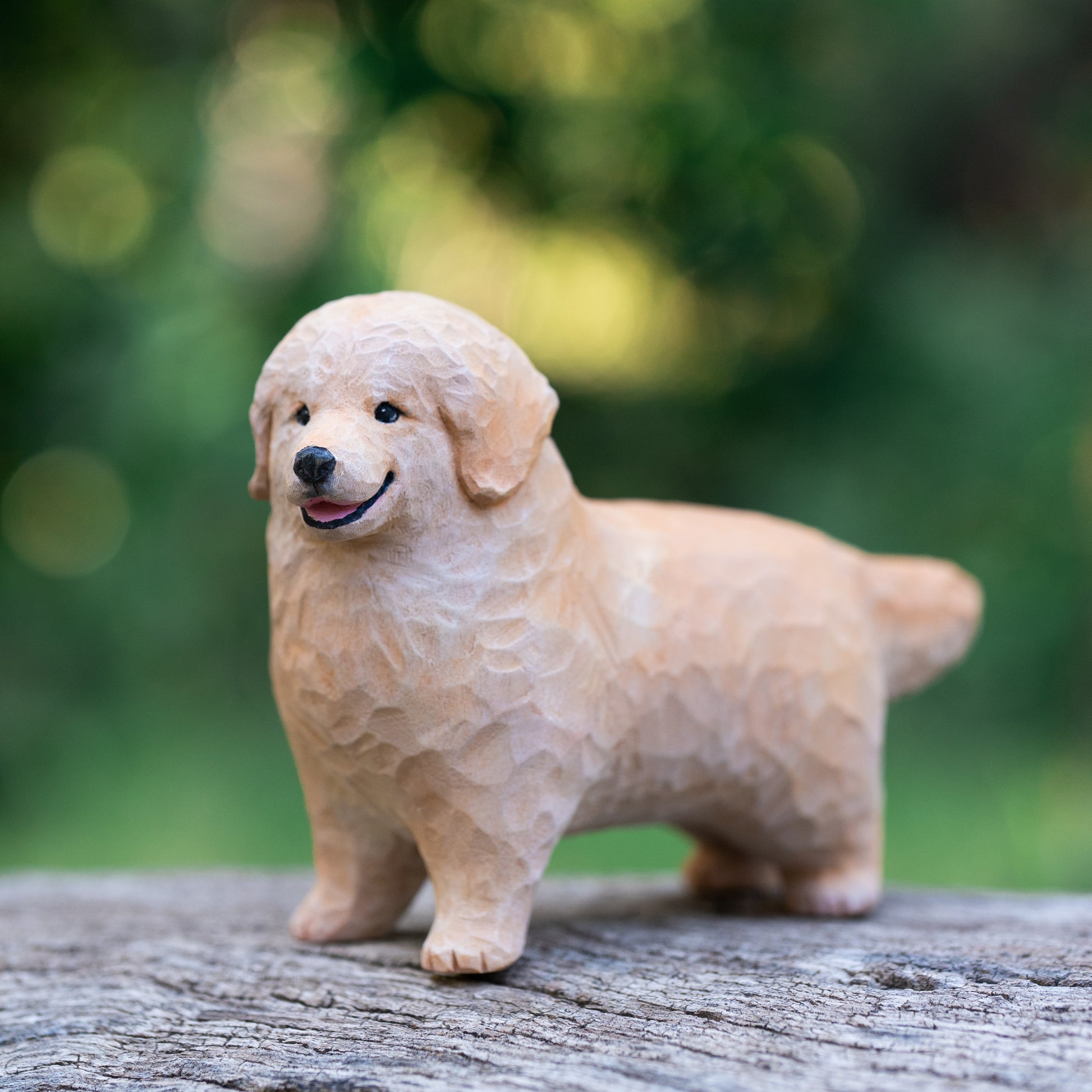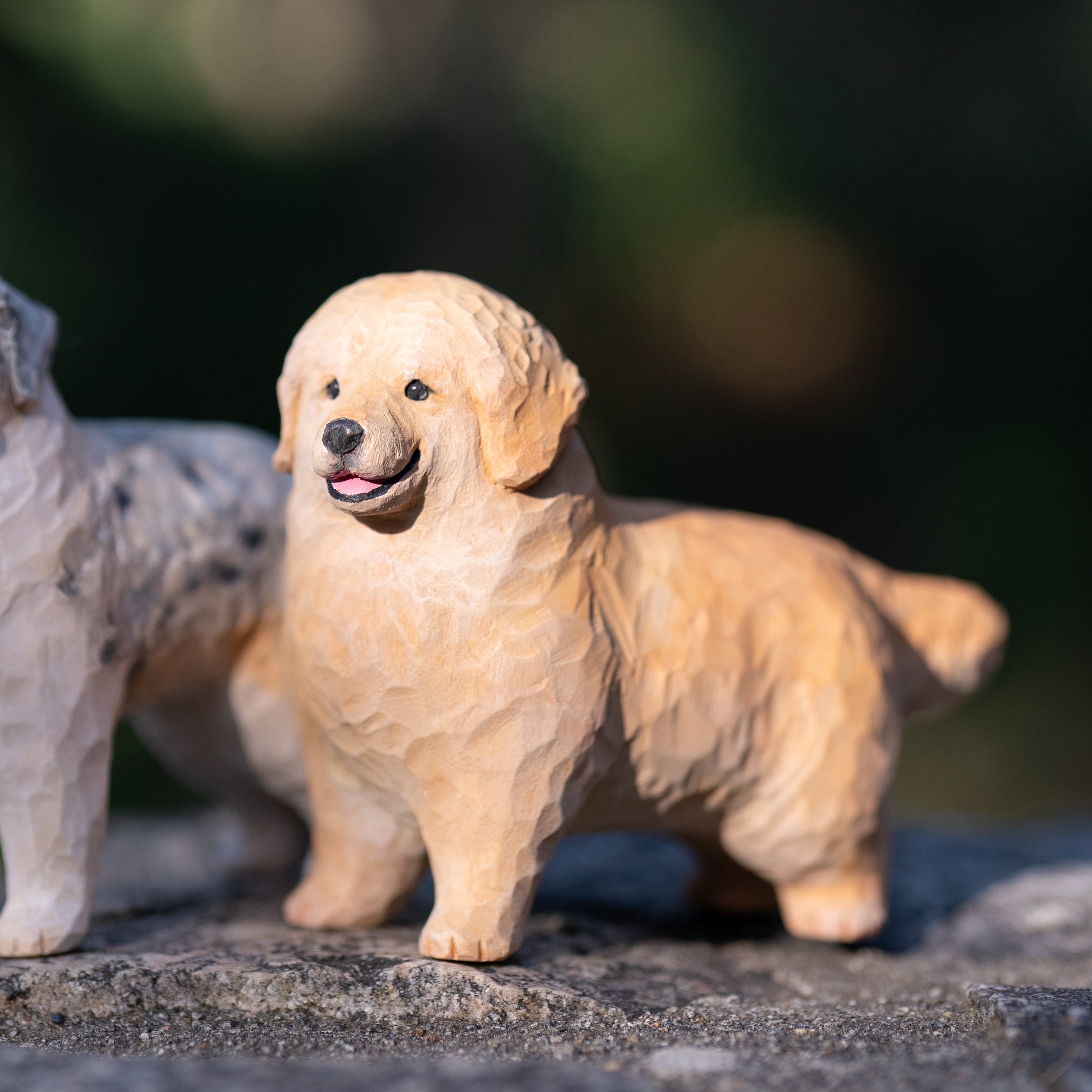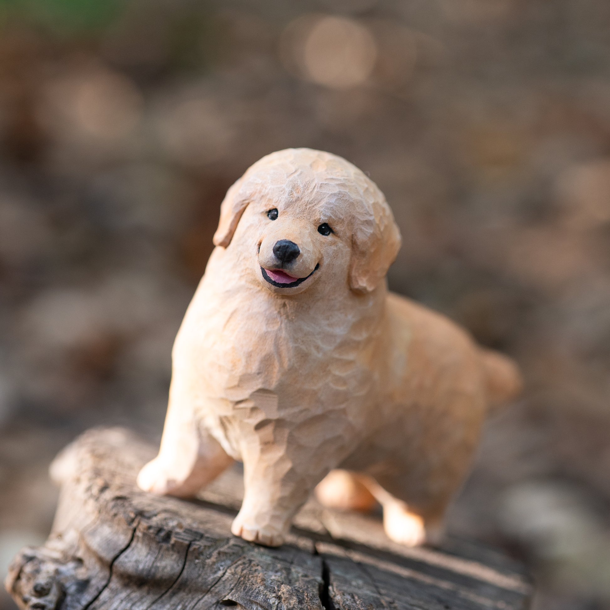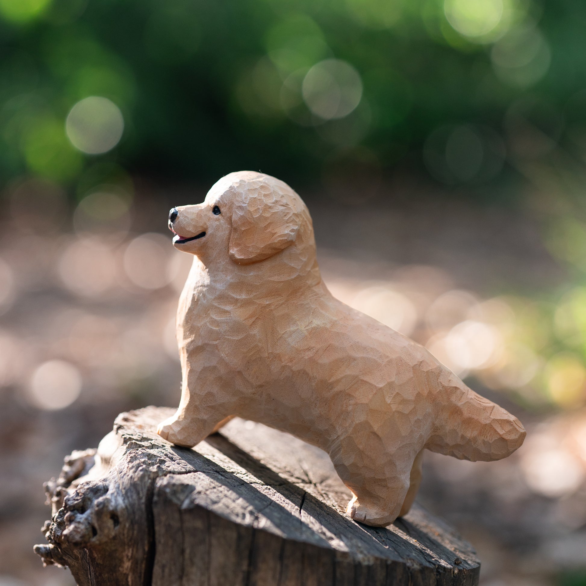 A hand-carved wooden sculpture capturing the gentle spirit of a standing dog. With soft eyes and a quiet smile, it seems to brighten at the very thought of you. It measures approximately 9 cm in height and 12 cm in length.